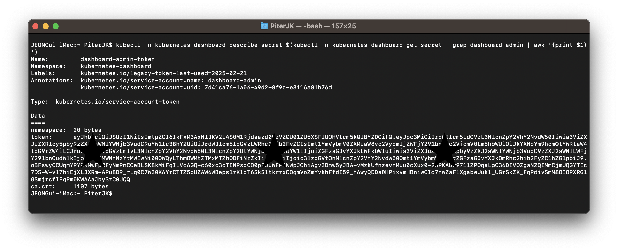 위 명령어 실행 후, "dashboard-admin-token-XXXX" 같은 Secret이 있으면, 다음 명령어로 해당 토큰을 가져올 수 있습니다.